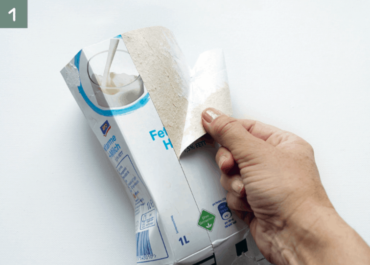 Zunächst schneidet man die obere und untere Seite des Tetrapacks auf. Dann zieht man die obere Schicht Papier komplett ab. Sollte sie sich nicht ablösen, muss man die Milchtüte vorher in Wasser einweichen.