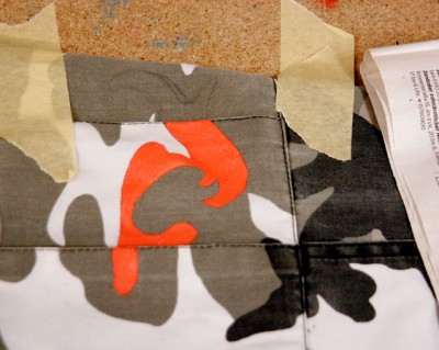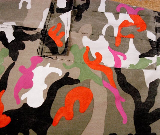 Militärisch angehauchten Funktionsklamotten kann man mit ein paar Farbklecksen einen ganz anderen Gesinnung einhauchen. Mithilfe von Stoffmalfarbe und der Tarn-Mustervorlage kann man einfach loslegen und sich ein Paradestück der ganz anderen Sorte zaubern.