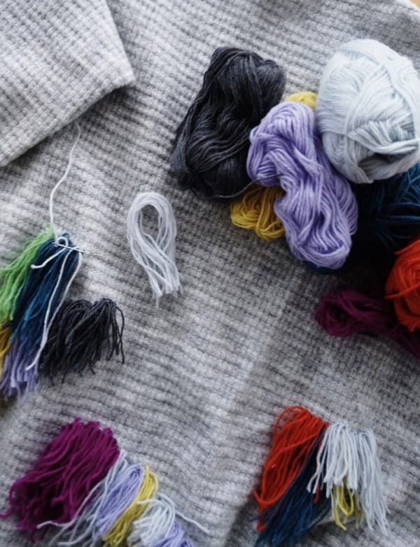 Beginne nun die einzelnen Fäden in den Pulli zu nähen und festzuknoten.