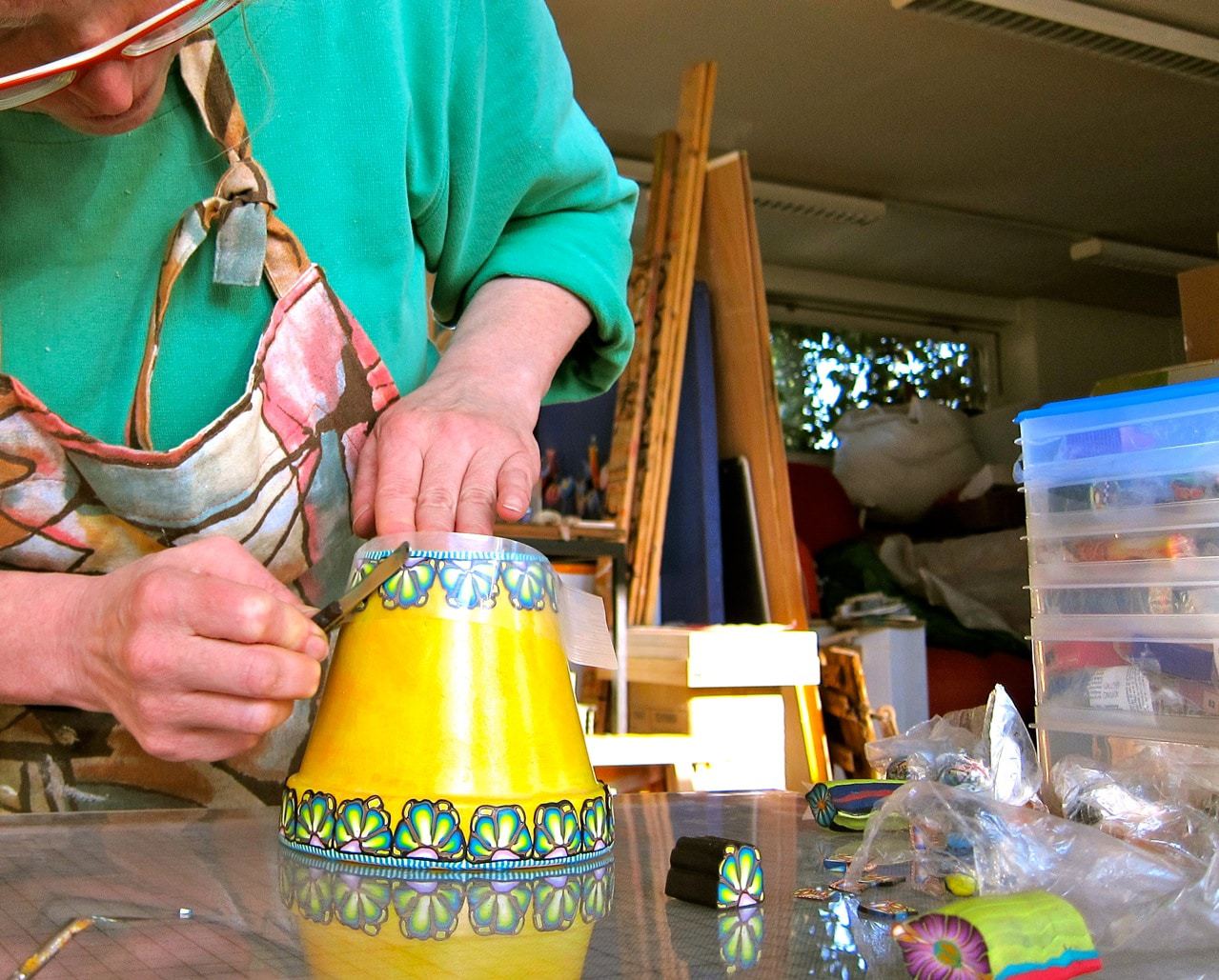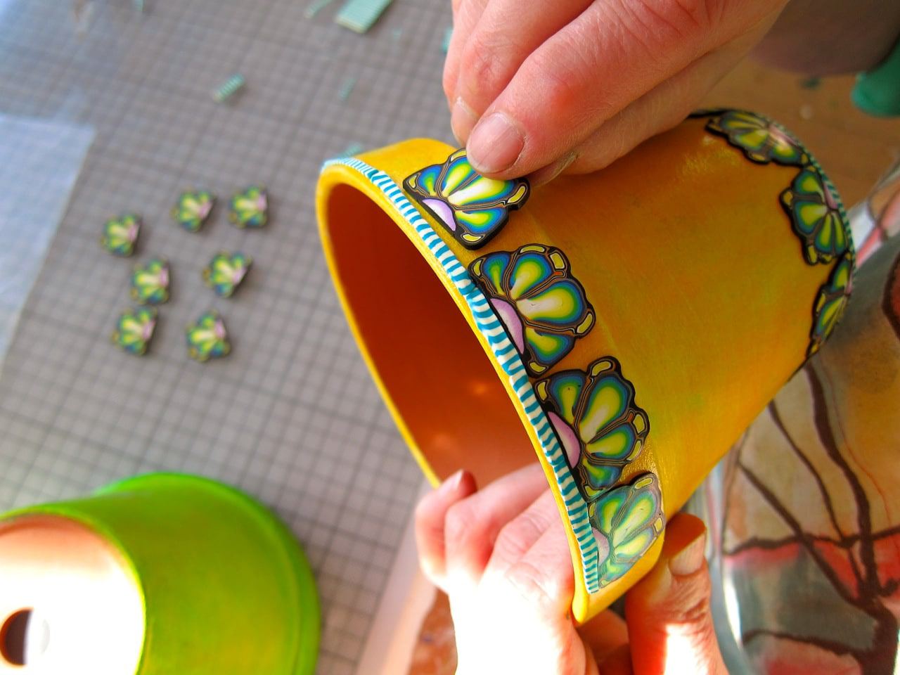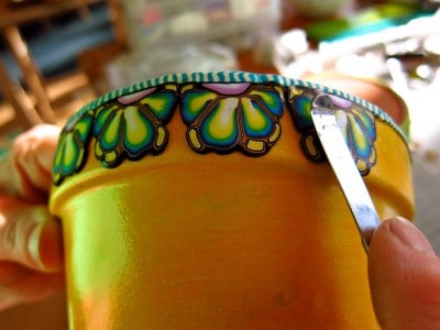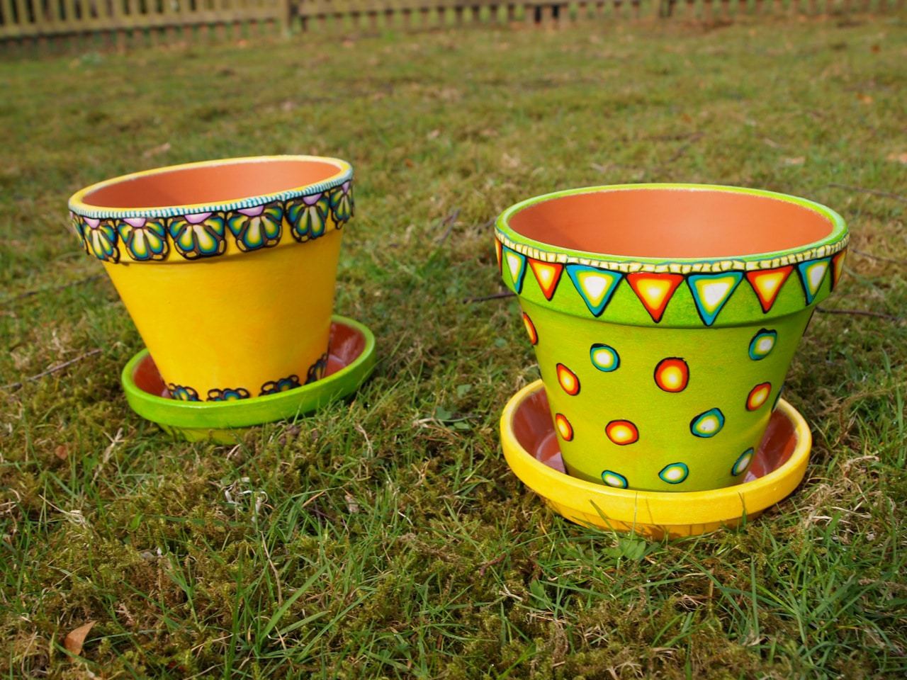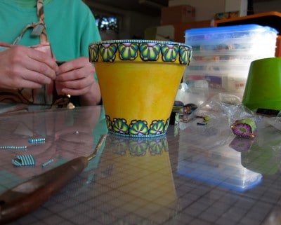 Frühling…Frühling…Frühling…den hol ich mir jetzt ins Haus und mal erstmal meine ganzen Blumentöpfe an. Und weil ich noch so viele, schon vorbereitete Fimo-Musterrollen habe, kriegen die Töpfe auch gleich alle noch eine Frühlingsborte ! Macht viel Spass und geht ganz einfach !!!