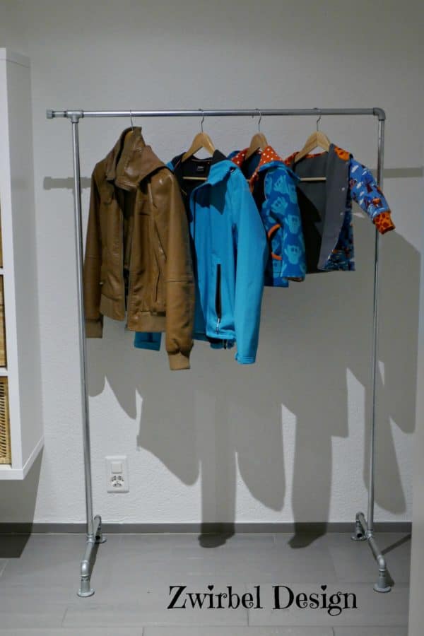 Wer gerne selbst eine maasgeschneiderte Garderobe im Industrialdesign zusammenschrauben möchte, schaut doch hier vorbei: https://zwirbeldesign.wordpress.com/2016/10/18/diy-garderobe-aus-wasserrohren/
