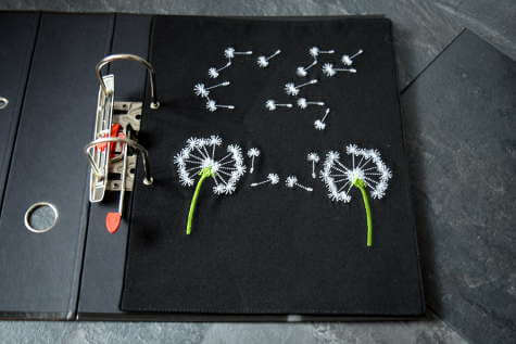 Die Trennlaschen sind selbst bestickt (mit der Stickdatei „Dandelion“ von Dawanda) und genäht. Gefüttert sind die beiden Stofflagen mit Decovil I Light. So bekommt das ganze eine schöne Festigkeit.