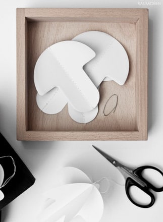 1. Schablone erstellen: Ein festes Blatt Papier falten und eine halbe Pilzsilhouette aufzeichnen und doppelseitig ausschneiden.