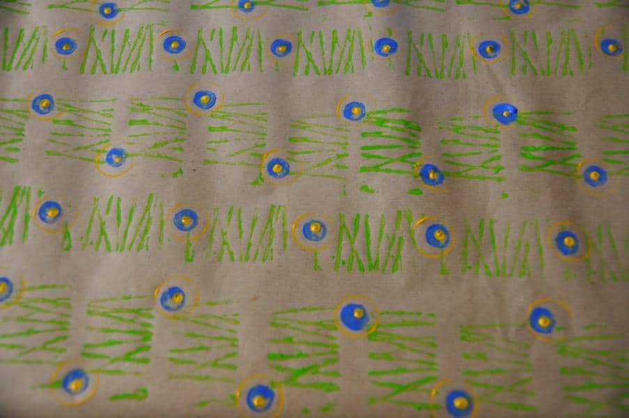 Packpapier mit Haushaltsgegenständen, wie Milchtütenverschlussdeckeln und Oropax bedrucken.
