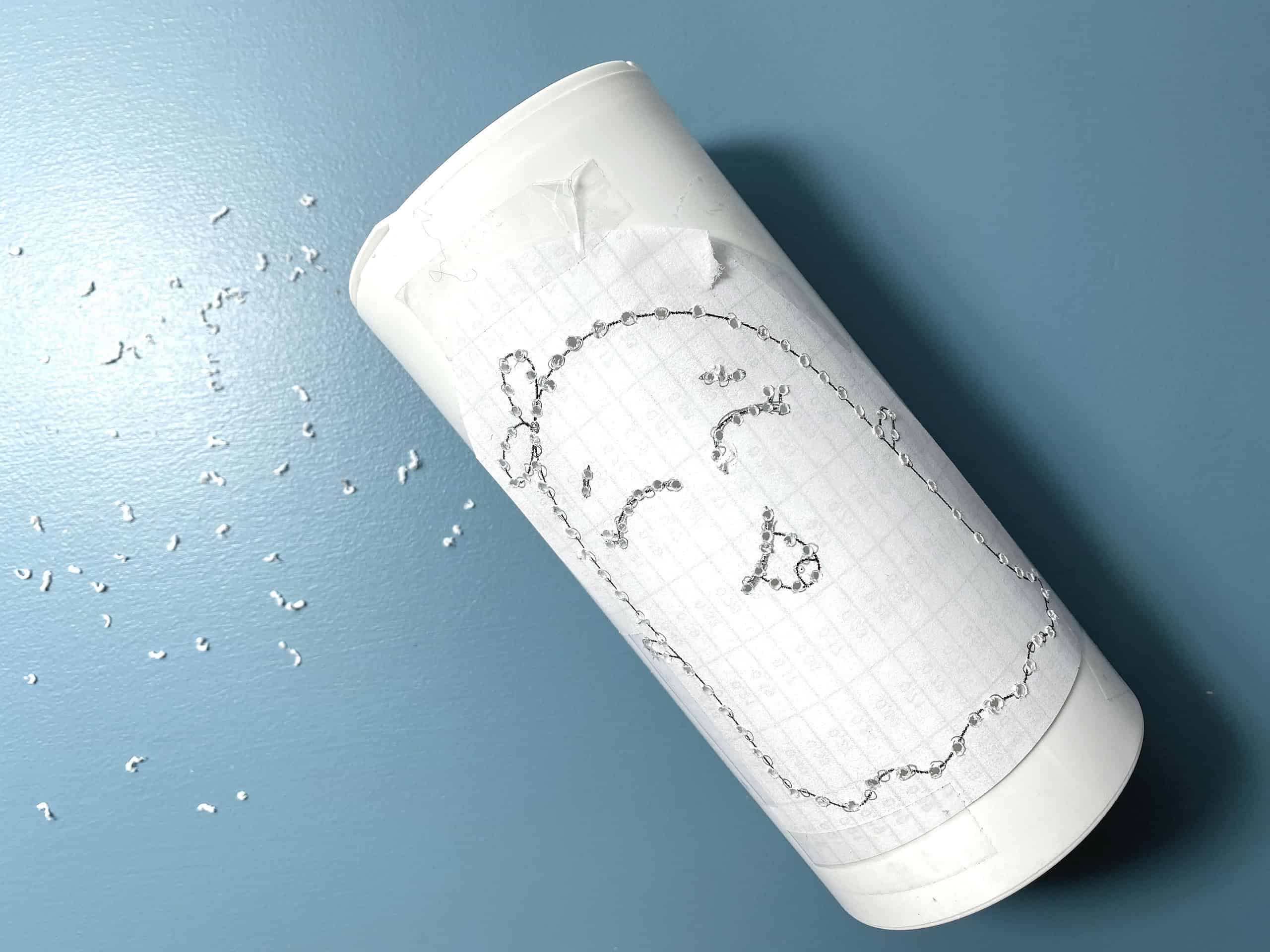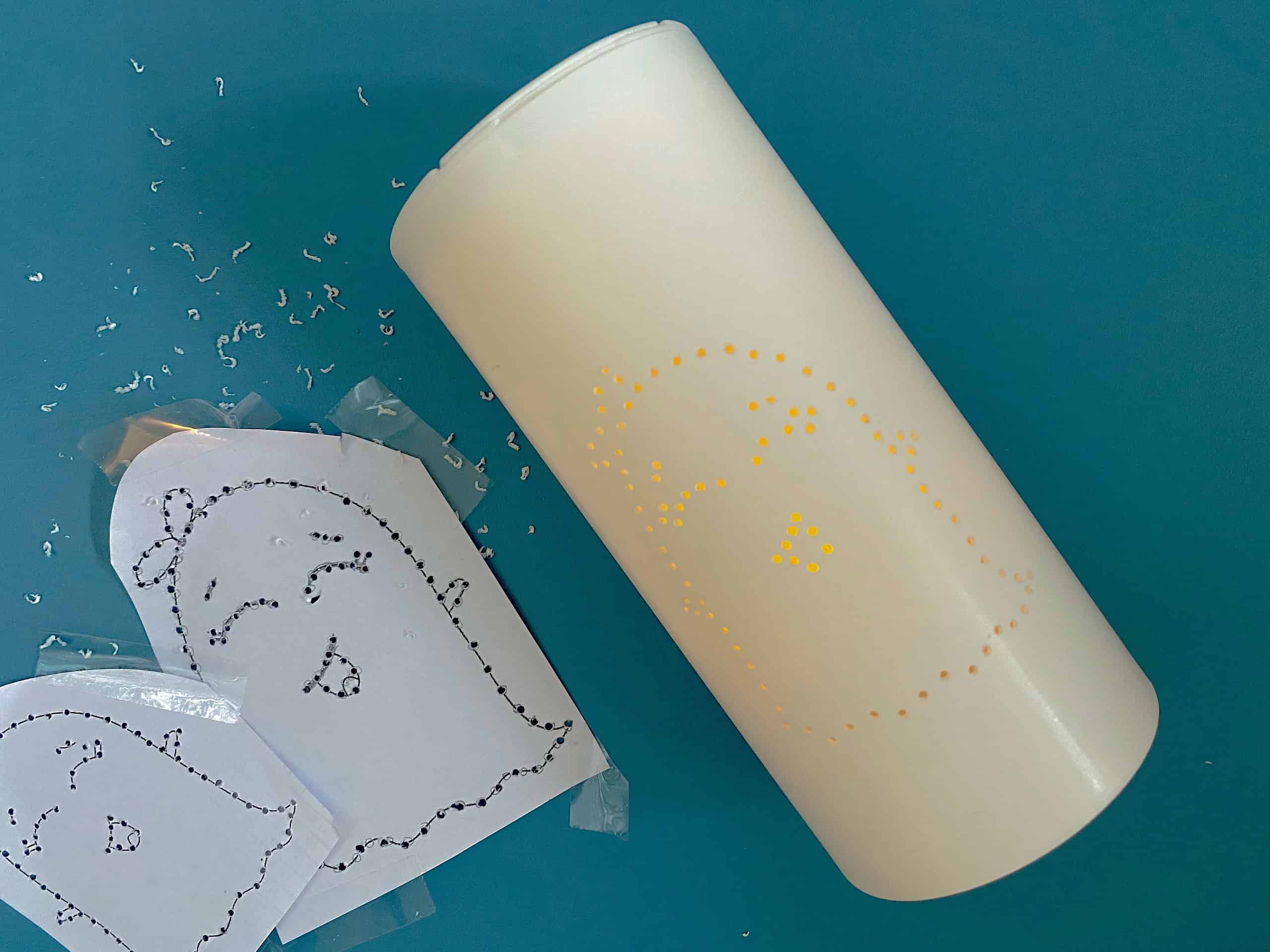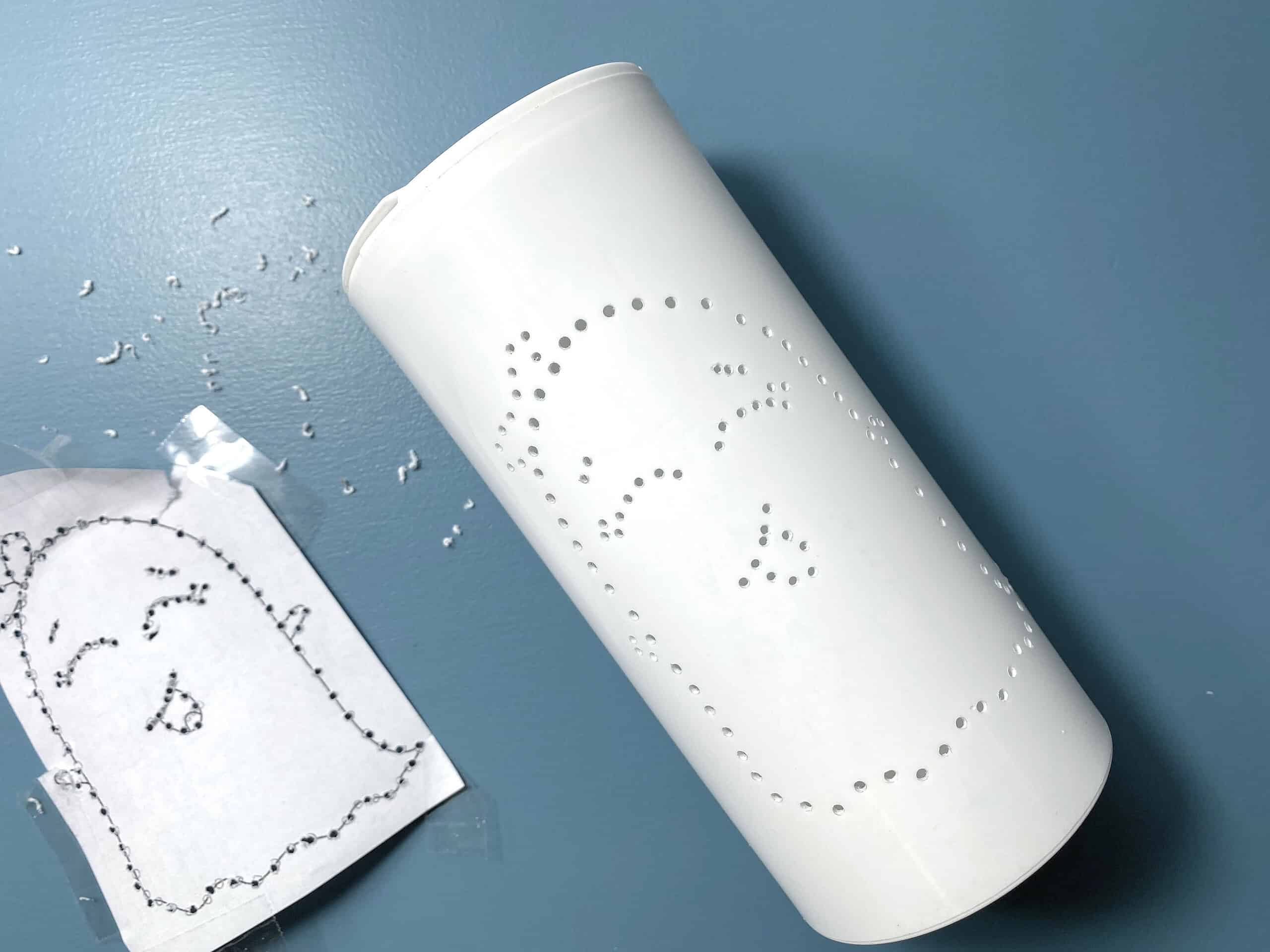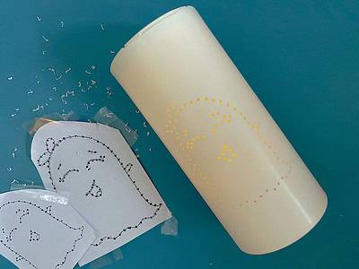 Und nun einfach die Kontur nachfahren, indem ihr in regelmäßigen Abständen Löcher durch Papier und Dose bohrt. Je kleiner der Bohraufsatz, desto filigraner könnt ihr arbeiten.