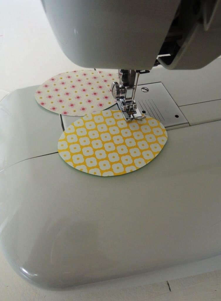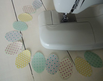 Die Ostereier mit der Nähmaschine aneinandernähen, dabei darauf achten am Anfang und Ende ein genügend langes Garnstück zulassen, um die Girlande später aufhängen zu können.