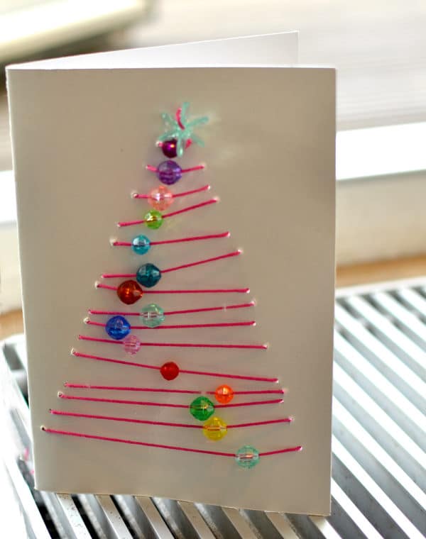 Wir basteln Weihnachtskarten mit aufgenähten und angehängten Tannenbäumen.