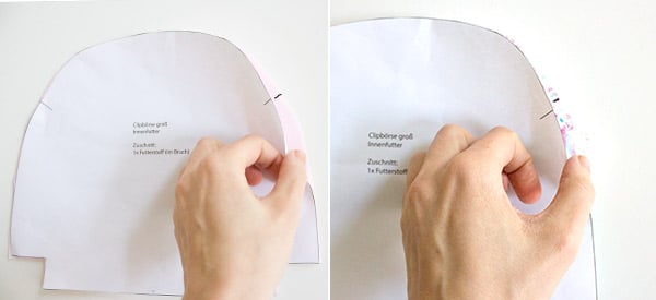 Lege die Schablone “Innenfutter” auf den Außenteil auf und übertrage die beiden Markierungen an der oberen Rundung mit Schneiderkreide auf den Stoff.