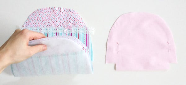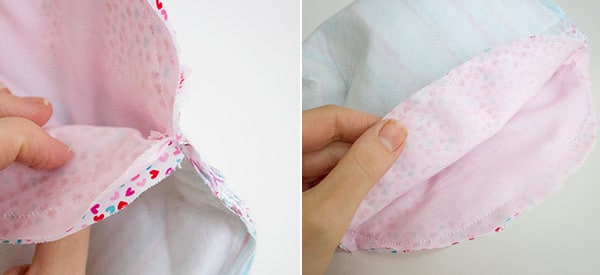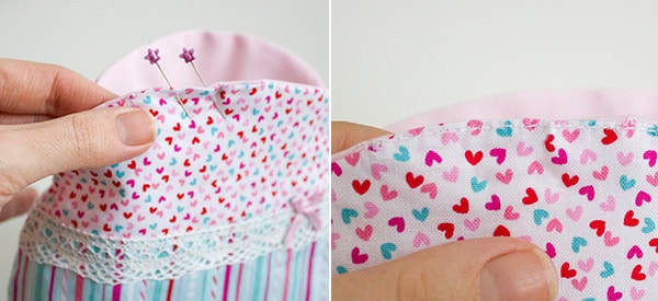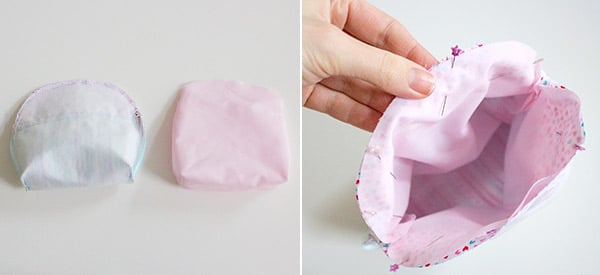 Wende die Innentasche (Futterstoff) auf rechts und stecke sie in die Außentasche (Oberstoff). Richte die Seitennähte bündig aus und fixiere die oberen Rundungen mit ein paar Nadeln.
