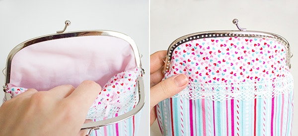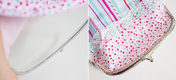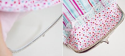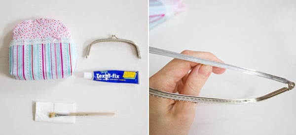 Klappe den Taschenbügel auf und bestreiche eine innere Rundung mit etwas Textilkleber. Das geht am besten mit einem flachen Pinsel. Nimm nicht zuviel Kleber, damit später nicht alles nach außen quillt.