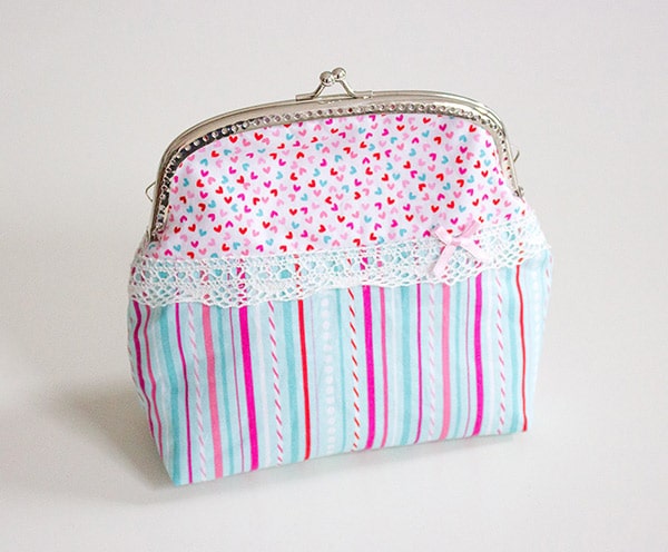 Die fertige Tasche ist 18cm x 15cm x 7cm groß und bietet genug Stauraum für all eure Schminkutensilien, wenn ihr sie als Kosmetiktasche verwenden wollt. Sie eignet sich aber auch super als Handtasche für besondere Anlässe. Wenn euer Taschenbügel kleine Ösen am oberen Rand hat, könnt ihr z.b. noch einen schmalen Trageriemen anbringen
