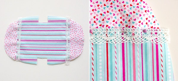 Schneide dann dein Spitzenband oder eine andere Verzierung in 2 Stücke à 14cm. Lege jeweils einen Streifen genau auf die Naht zwischen Oberteil und Unterteil des Außenstoffs und fixiere sie mit ein paar Nadeln. Steppe anschließend beide Verzierungen knappkantig am Außenteil fest.