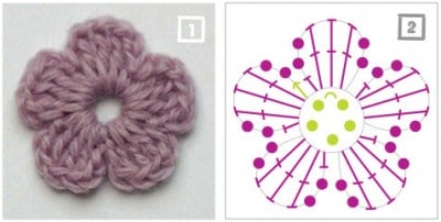 Die Blüte wird in zwei Runden gearbeitet; sie ist sehr einfach gehäkelt und schnell fertig.