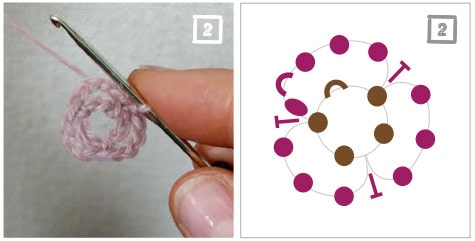 Die Blüte wird in fünf Runden gearbeitet. Zuerst häkelt man mit Runde 1 die Basis, auf die dann mit Runde 2 und 3 der innere, kleine Blütenring gehäkelt wird. Hinter diesen inneren Blütenring wird dann wiede- rum auf Runde 1 der zweite, größere Blüten- blätterring mit Runde 4 und 5 gearbeitet. So entsteht ein schönes und dichtes Blüteninneres mit zwei sehr plastischen Blütenreigen mit sechs kleinen inneren und sechs größeren, äußeren Blütenblättern.