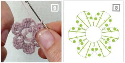 Jeweils zwei Blütenblätter in einen Luftmaschen- bogen der Vorreihe arbeiten. Zuerst in den