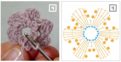 Nun entsteht eine zweite Reihe mit sechs größeren Blütenblättern, die sich plastisch hinter der ersten Blütenblätterreihe von Runde 3 entfaltet. Dazu werden 6 Luftmaschenringe mit jeweils 4 Luftmaschen und einer festen Masche gehäkelt. So entstehen sechs 3er-Luftmaschenbögen, die mit festen Maschen in der 1. Runde festmachen.