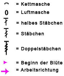 15 halbe Stäbchen in Fadenring arbeiten, dann 3 Blütenblätter wie im Diagramm unten abgebildet arbeiten, jeweils ein Blütenblatt in die 5 Maschen der Vorreihe.