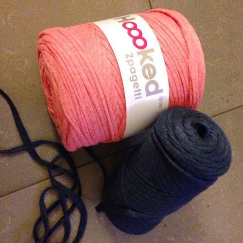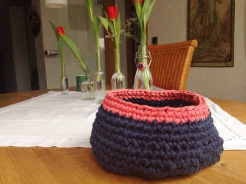 Ich habe mir das T-Shirt-Garn (Zpagetti) von Hoooked n den Farben “Medium Denim Blues” und “Persimmon Pink Orange” ausgesucht. Obwohl ich zum aller ersten Mal gehäkelt habe, ging es super fix und ich hatte den Korb an einem Fernsehabend fertig. Hier gibt’s eine super Viedeoanleitung.