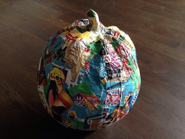Mit einem Xl-Luftballon und Zeitung zum Halloween Kostüm.