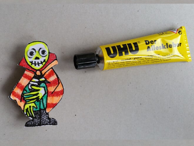 Mit doppelseitigem Klebeband befestigst Du hinten eine Wäscheklammer. Entweder so, dass die Figur danach als unheimlicher Fotohalter stehen kann, oder als schauriger Anstecker.