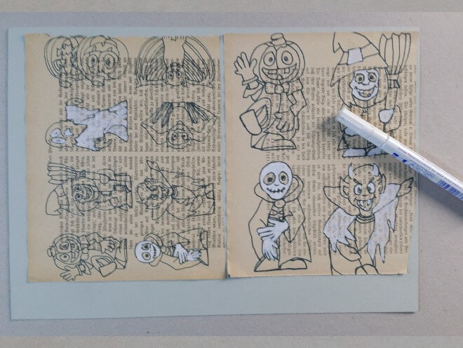 Wenn Du sie auf einer alten Gruselgeschichten-Buchseite ausdruckst, dann sieht es besonders schauderhaft aus, wenn Du einzelne Stellen mit weißem Edding bemalst.