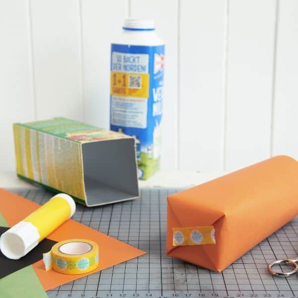 2. Oranges Papier zurecht schneiden, Packung wie ein Geschenk umwickeln und am unteren Ende verpacken, mit Klebestift oder Tesa befestigen.