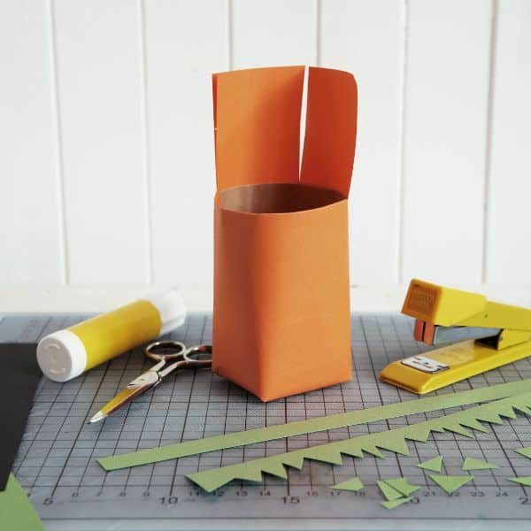 Tetrapaks, Tonpapier in orange, grün und schwarz, Schere, Klebestift und einen Tacker.