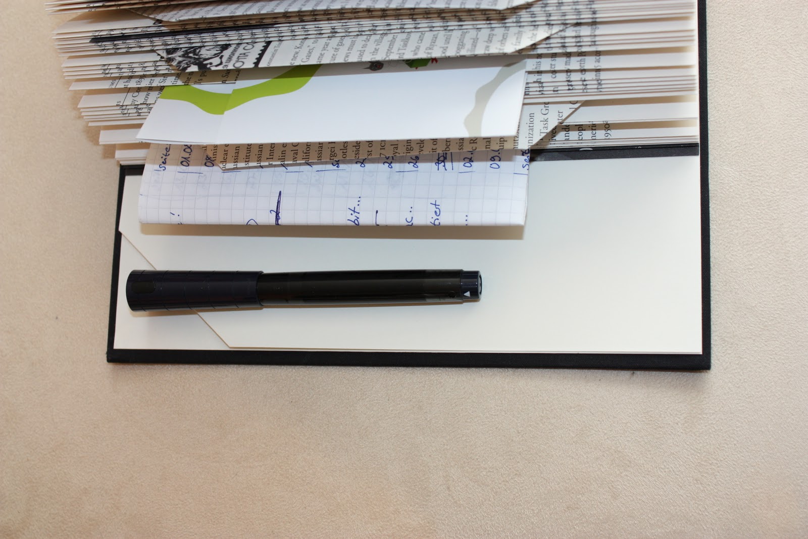 Bis auf die Registerblätter habe ich schon einige „gebastelt “ und verschenkt oder in öffentlichen Bücherregalen ausgesetzt. Bei mir auf dem Tisch liegt auch so ein Zettelchaosbuch und es gefällt mir sehr gut!