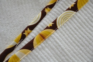 Alte Handtücher können einem immer noch Tränen der Rührung in die Augen treiben, wenn sie mit dem aktuellen Lieblingsstoff aufgehübscht werden. In diesem Fall ist er gekauft, aber wenn Ihr noch eine ausgediente, aber geliebte Gardine oder Bettwäsche habt, ist das Projekt sogar völlig kostenfrei und damit auch recycelt.