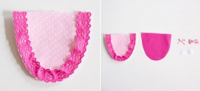 Lege die Spitze nach innen zeigend an den äußeren Rand der Klappe aus Oberstoff an und stecke sie mit ein paar Nadeln fest. Da wir die Klappe später mit 1cm Nahtzugabe zusammennähen, muss deine Spitze ca. 1,5cm breit sein bzw. so positioniert werden, dass nach dem Abnähen noch 0,5cm Spitze überstehen. Nähe dann das Spitzenband knappkantig an die äußere runde Kante der Klappe aus Obertstoff.