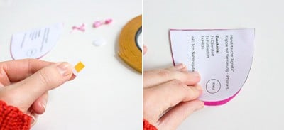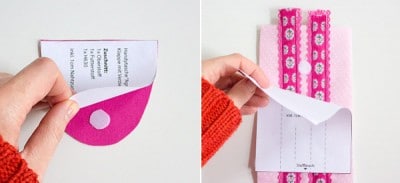 Schneide dann ein kleines Stück vom Stylefix (doppelseitiges Klebeband) und klebe es auf die Rückseite des ersten Klett-Kreises. Lege dann die Schablone “Klappe” auf die Klappe aus Futterstoff.