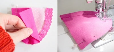 Anschließend legst du an der dritten & vierten Markierung ebenso das Spitzenband an und steckst es mit Nadeln fest.