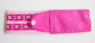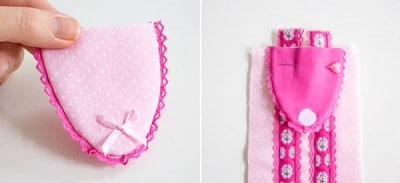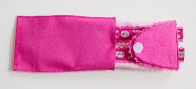 Nun kannst du die Klappe wenden und bügeln. Zum Schluss kannst du auf die Vorderseite der Klappe noch ein Schleifchen oder eine Stoffblume aufnähen.