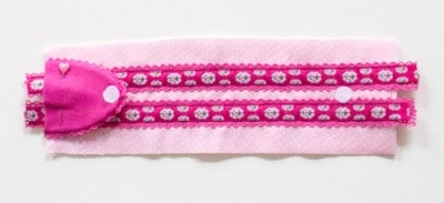 An der Markierung für den Klettverschluss klebst du nun den ersten Klettkreis auf und steppst diesen dann knappkantig mit weißem Nähgarn an.