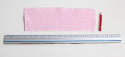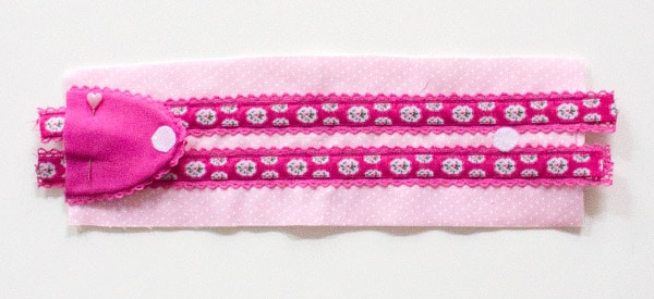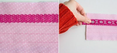 Um den richtigen Abstand für die Spitzenbänder festzulegen, kannst du testweise dein gewünschtes Webband auflegen und so die optimale Breite des Spitzenbänder bestimmen. An den kurzen Seiten des Schnittteiles steht das Spitzenband ca. 1,5 – 2cm über.