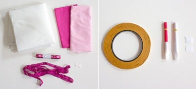 Lege dir nun eine Schleife / Stoffblume, sowie das Klettband zurecht. Für den Klettverschluss schneidest du aus dem Hakenband und dem Flauschband einen jeweils 1cm breiten Kreis aus.