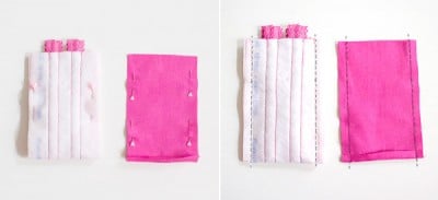 Lege beide Stoffteile “Futter” rechts auf rechts übereinander und fixiere sie an einer kurzen Seite mit einer Nadel. Steppe eine kurze Seite dann mit 1cm Nahtzugabe ab, wobei du in der Mitte eine ca. 5cm breite Wendeöffnung lässt.