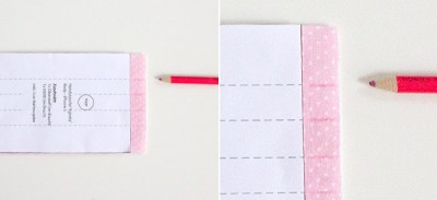 Steppe dann entlang beider Seiten mit 1cm Nahtzugabe. Bei der Innentasche (im Bild pink) klappst du dabei die Nahtzugabe auf den Stoff, so dass diese mit angenäht wird.