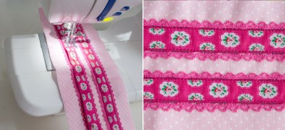 Steppe dann mittig über beide Spitzenbänder, so dass diese am Stoff befestigt werden. Steppe dann das Webband knappkantig über der Spitze an.