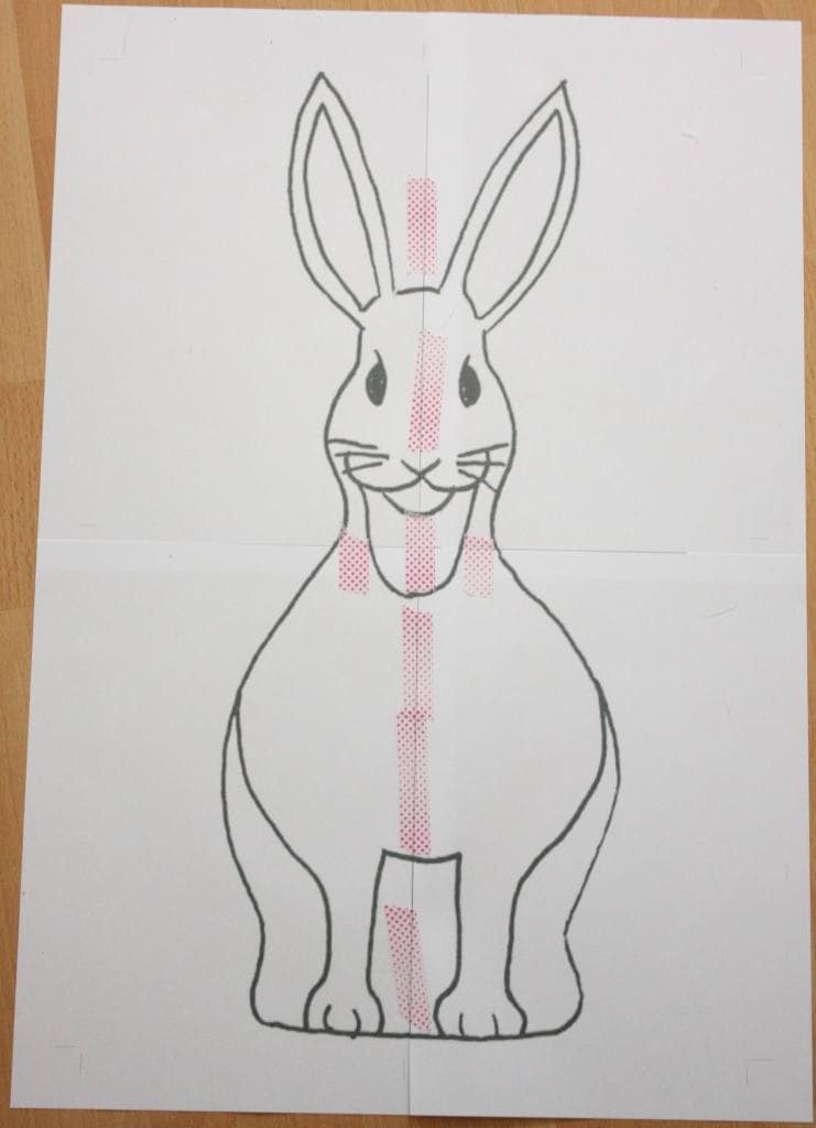Schneidet jeweils eine Seite an den Schnittmarken zurück und klebt die Blätter aneinander. Schneidet anschließend den Hasen an den Außenlinien aus.