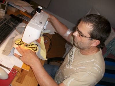 So z. B. war für unsere Männer Motorradfahren wichtig. Also haben sie sich Vorlagen von ihren Motorrädern gesucht, Haftvlies (das von beiden Seiten bebügelt werden kann) mit Motiv seitenverkehrt aufgemalt. Das geht am Fenster und noch besser, wenn man hat, am Leuchttisch. Dann wird dieses Vlies auf den Stoff des Motorrads gebügelt, ausgeschnitten, dann das Papier abgezogen und jetzt umgedreht auf das Quadrat gebügelt. Jetzt braucht es nicht mit Nadeln festgesteckt werden und kann mit der Nähmaschine festgenäht werden. Jeder von uns hat sein Quadrat ganz individuell genäht, bestickt und auch bedruckt.