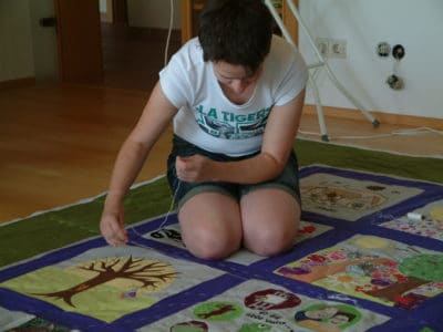 Wir haben uns dann zusammen geholfen und dann angefangen die Quadrate zu nähen. Aufnäher wurden gesammelt und das, was nicht dabei war, haben wir halt selber entwickelt.