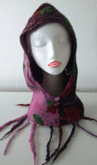 Ein Hoodie für den Wettbewerb! Ich habe mir zwei Nunofilzschals ausgewählt, die ich nicht mehr so oft trage und diese sollten nun in einer neuen textilen Gestaltung zur Geltung kommen. Zwei Schals ergeben nun ein neues Hoodie. Ich habe die Form für meine Kopfgröße etwas verkleinert und den Aussenrand noch mit einem Stickstich umrandet und ein paar Applikationen und Perlen angenäht. Ich brauche aber auch kein Innenfutter, da die handgefilzten Schals auch eine schöne Innenseite haben und auch so schön wärmen.