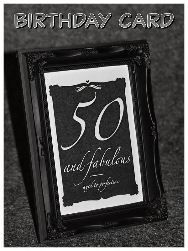 Zu-viele-Kerzen-Kuchen, 50 Rocks, schwaz-weiß-gestreifte Ziffern mit Pailletten, eingerahmte Geburtstagskarte und ein persönliches Gästebuch.