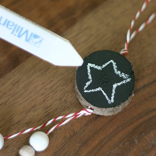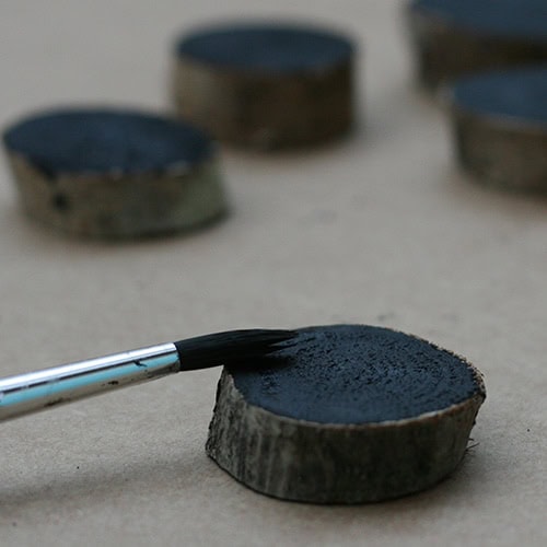 Nun werden die Holzscheiben von beiden Seiten mit Tafellack bemalt. Am besten etwas unterlegen, denn Tafellack haftet sehr gut und lässt sich schlecht entfernen.
