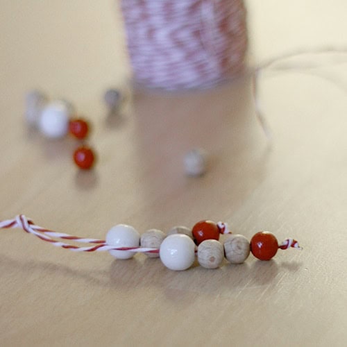 Nun ein Stück Kordel nehmen, etwa 20 cm. Am einen Ende einen Knoten machen und Perlen aufziehen. Das Ganze doppelt und dann am anderen Ende einen Knoten machen.