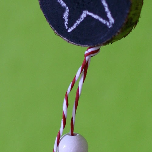Zuerst müsst ihr die Holzscheiben durchbohren. Dafür braucht ihr auf jeden Fall einen Holzbohraufsatz und am besten noch einen Schreibstock um die Scheiben zu fixieren. Dann einmal komplett durchbohren. 3 - 4 Millemeter Durchmesser reichen völlig.