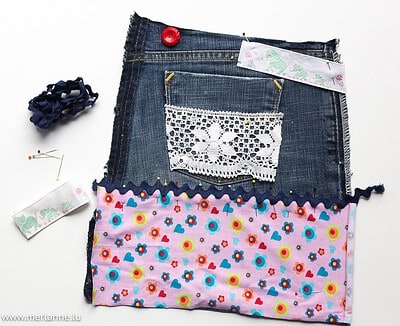 Die Jeansbeine auftrennen und zurechtschneiden: ein Vorderteil und ein Hinterteil mit Tasche. Nun die Teile schmücken, in dem Ihr Stoff-, Spitzen- und Bänderreste mit der Nähmaschine aufsteppt. Den oberen Rand der Spitze auf der Tasche habe ich mit ein paar Stichen per Hand befestigt, denn sonst hätte ich die Tasche zugesteppt.