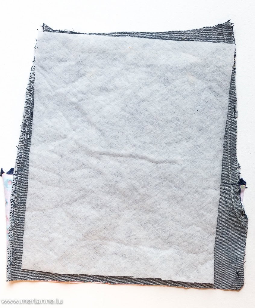 Nun die Vlieseline auf die gewünschten Maße zuschneiden und auf die linke Seite der beiden Außenteile aufbügeln. Das macht die Tasche standfester. Rundherum gerade zurechtschneiden. Beim Berechnen der Maße (abhängig von der Breite der Jeansbeine) an die Nahtzugaben von 1 cm denken!