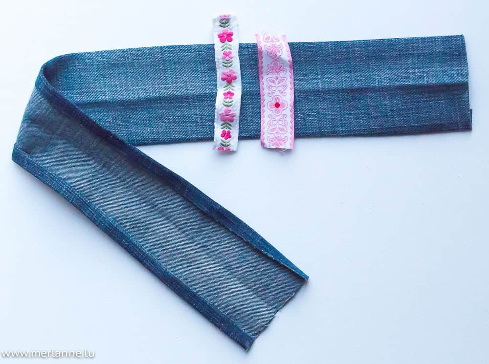 Für das Schulterband aus einem Jeansbein ein Stück in den Maßen 70 cm x 6 cm zurechtschneiden. Kleine Webbandstücke aufnähen.